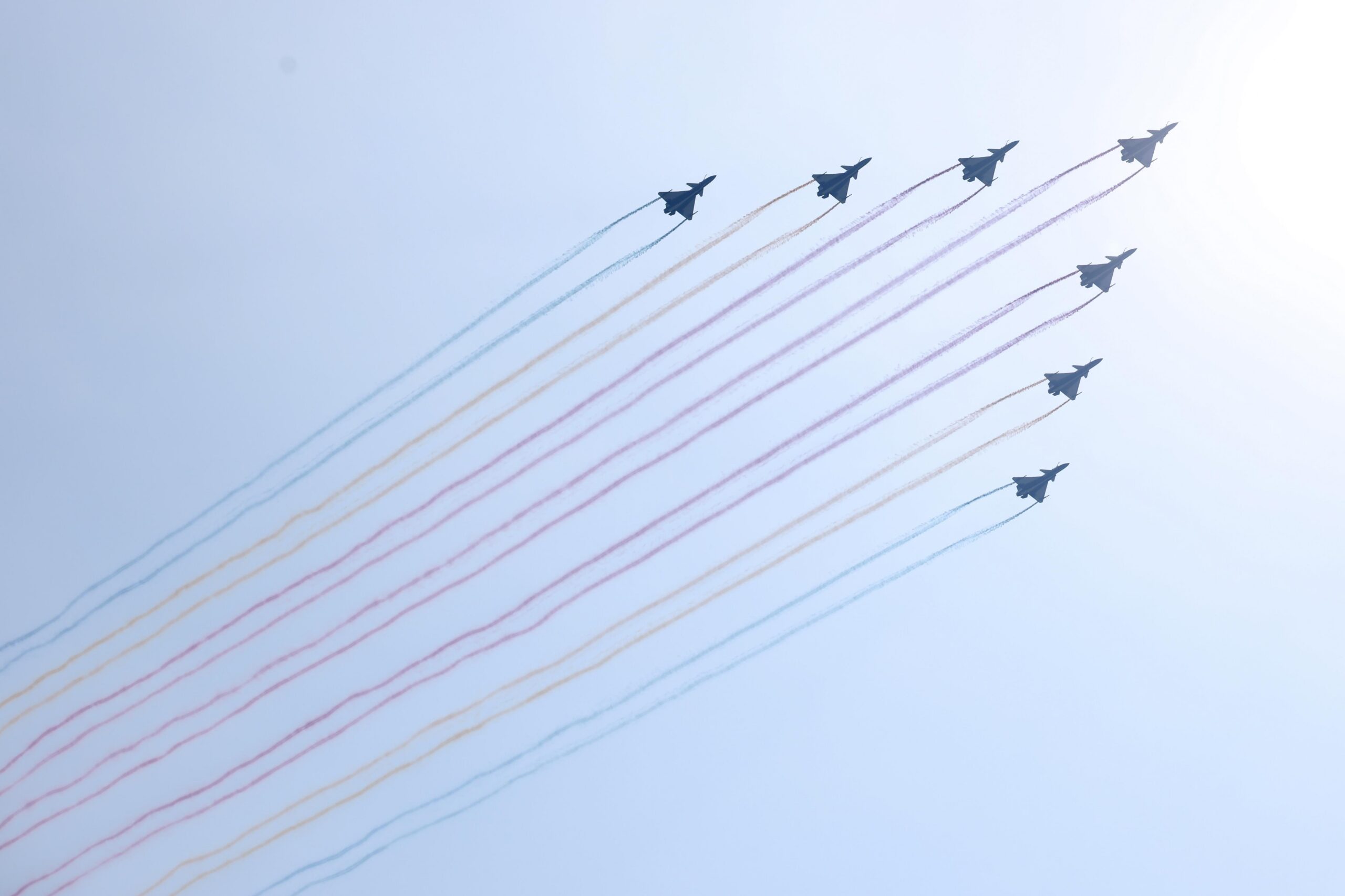 当歼击机梯队呼啸而过时,其庞大的机身几乎占据了整个画面,引得人群发出一阵惊呼