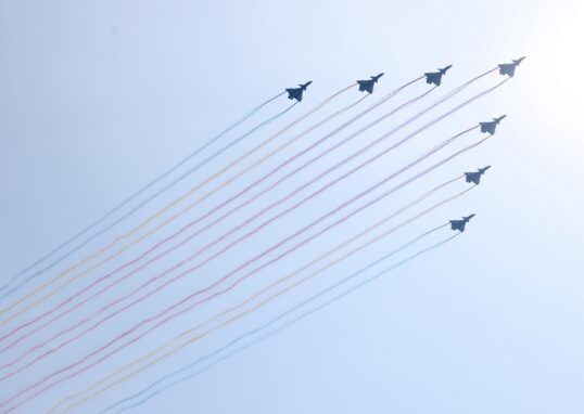 - 分列式 – 第三部分:空中梯队 (10:17):由预警机、轰炸机、运输机、加油机、歼击机等百余架飞机组成的空中梯队,以多个编队飞越天安门上空 18。最后,教练机梯队拉出14道彩烟,再次呼应“14年抗战”的历史主题 5。